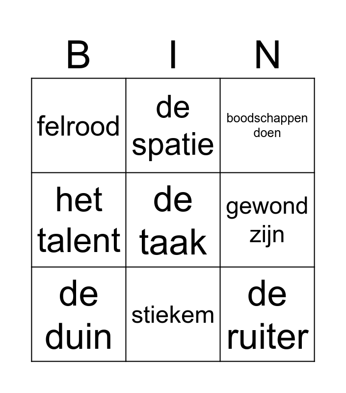 This bingo card has a free space and 8 words: gewond zijn, boodschappen doen, de spatie, de duin, felrood, de ruiter, het talent and stiekem.