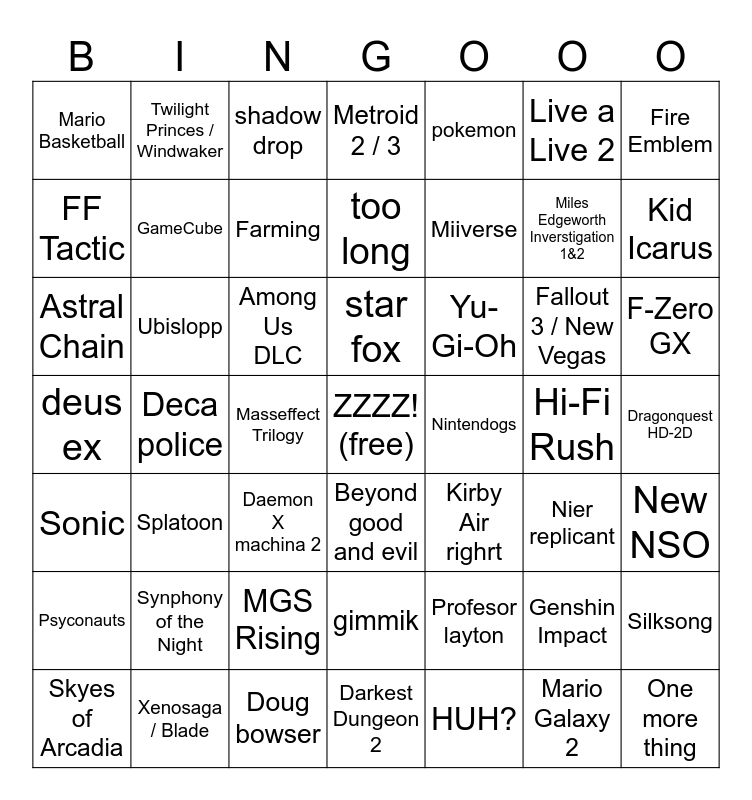 This bingo card has a free space and 48 words: Profesor layton, Miles Edgeworth Inverstigation 1&2, Darkest Dungeon 2, Deca police, Among Us DLC, Dragonquest HD-2D, Twilight Princes / Windwaker, Xenosaga / Blade, Live a Live 2, Beyond good and evil, Fire Emblem, Metroid 2 / 3, Fallout 3 / New Vegas, Yu-Gi-Oh, Psyconauts, Hi-Fi Rush, FF Tactic, Kid Icarus, Genshin Impact, pokemon, Miiverse, Masseffect Trilogy, Mario Basketball, GameCube, Silksong, Farming, F-Zero GX, Skyes of Arcadia, star fox, Ubislopp, Mario Galaxy 2, Nintendogs, New NSO, Synphony of the Night, deus ex, Kirby Air righrt, Nier replicant, Astral Chain, Daemon X machina 2, MGS Rising, Sonic, One more thing, shadow drop, Doug bowser, too long, gimmik, Splatoon and HUH?.