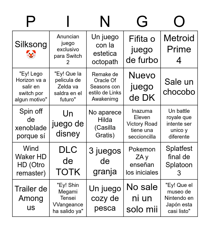 This bingo card has a free space and 24 words: DLC de TOTK, "Ey! Shin Megami Tensei VVangeance ha salido ya", Remake de Oracle Of Seasons con estilo de Links Awakenimg, Trailer de Among us, Metroid Prime 4, Silksong 🤡, "Ey! Lego Horizon va a salir en switch por algun motivo", Anuncian juego exclusivo para Switch 2, Inazuma Eleven Victory Road tiene una seccioncilla, 3 juegos de granja, Nuevo juego de DK, Spin off de xenoblade porque sÃ, Pokemon ZA y enseñan los iniciales, Splatfest final de Splatoon 3, "Ey! Que la pelicula de Zelda va saldra en el futuro", No sale ni un solo mii, Un battle royale que intente ser unico y diferente, Un juego con la estetica octopath, Sale un chocobo, Un juego de disney, "Ey! Que el museo de Nintendo en Japón esta casi listo", Wind Waker HD HD (Otro remaster), Fifita o juego de furbo and Un juego cozy de pesca.