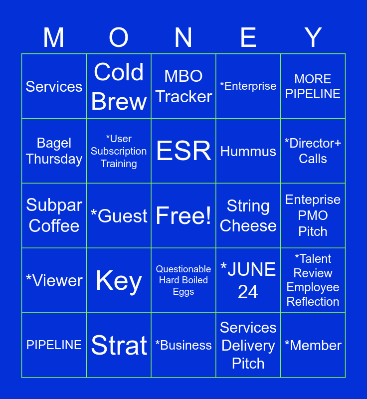 This bingo card has a free space and 24 words: Key, Strat, ESR, PIPELINE, MORE PIPELINE, Services, Bagel Thursday, Cold Brew, String Cheese, Questionable Hard Boiled Eggs, Hummus, Subpar Coffee, *JUNE 24, *Talent Review Employee Reflection, *User Subscription Training, Services Delivery Pitch, Enteprise PMO Pitch, MBO Tracker, *Director+ Calls, *Guest, *Member, *Viewer, *Enterprise and *Business.