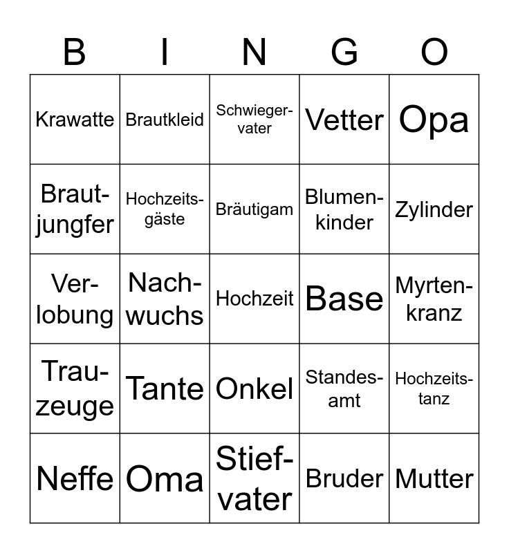 This bingo card has a free space and 44 words: Vater, Mutter, Nichte, Neffe, Schwester, Bruder, Schwieger- vater, Schwieger- mutter, Opa, Oma, Vetter, Base, Onkel, Tante, Stief- mutter, Stief- vater, Geburts- tage, Ver- lobung, Braut- strauß, Zylinder, Brautkleid, Frack, Fliege, Krawatte, Schleier, Myrten- kranz, Verlobungs- ring, Trau- ring, Standes- amt, Trau- zeuge, Polter- abend, Hochzeits- tanz, Hochzeits- nacht, Flitter- wochen, Nach- wuchs, Schwanger- schaft, Geburt, Braut, Bräutigam, Braut- jungfer, Blumen- kinder, Pfarrer, Hochzeits- gäste and Heirats- antrag.