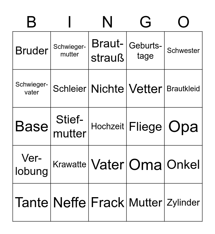 This bingo card has a free space and 26 words: Vater, Mutter, Nichte, Neffe, Schwester, Bruder, Schwieger- vater, Schwieger- mutter, Opa, Oma, Vetter, Base, Onkel, Tante, Stief- mutter, Stief- vater, Geburts- tage, Ver- lobung, Braut- strauß, Zylinder, Brautkleid, Frack, Fliege, Krawatte, Schleier and Myrten- kranz.