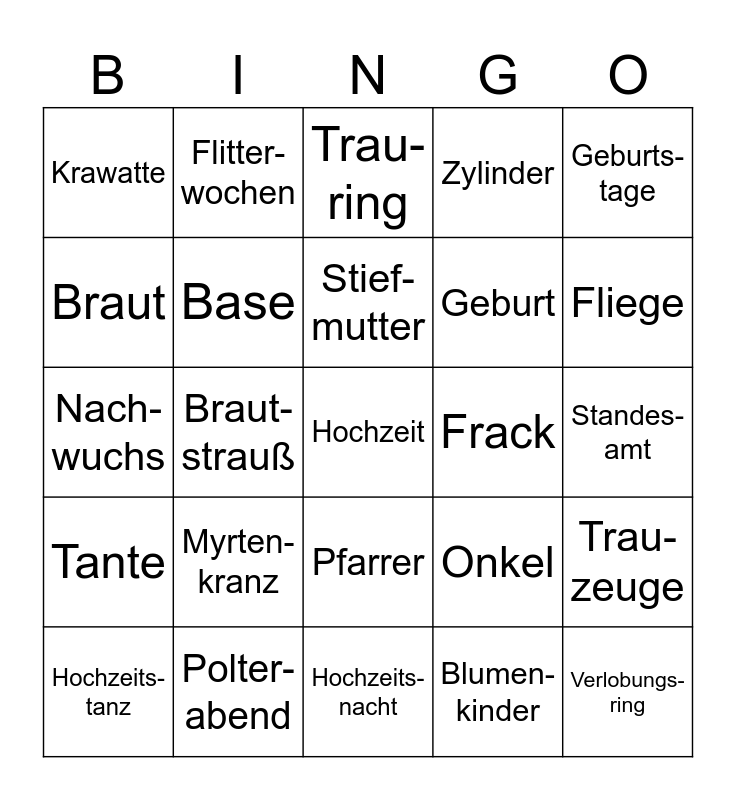 This bingo card has a free space and 36 words: Opa, Oma, Vetter, Base, Onkel, Tante, Stief- mutter, Stief- vater, Geburts- tage, Ver- lobung, Braut- strauß, Zylinder, Brautkleid, Frack, Fliege, Krawatte, Schleier, Myrten- kranz, Verlobungs- ring, Trau- ring, Standes- amt, Trau- zeuge, Polter- abend, Hochzeits- tanz, Hochzeits- nacht, Flitter- wochen, Nach- wuchs, Schwanger- schaft, Geburt, Braut, Bräutigam, Braut- jungfer, Blumen- kinder, Pfarrer, Hochzeits- gäste and Heirats- antrag.
