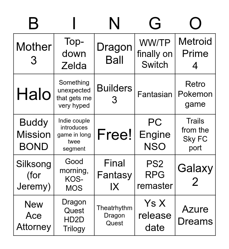 This bingo card has a free space and 24 words: Good morning, KOS-MOS, Dragon Quest HD2D Trilogy, Builders 3, New Ace Attorney, Metroid Prime 4, Mother 3, Halo, Top-down Zelda, PC Engine NSO, Final Fantasy IX, Fantasian, Buddy Mission BOND, PS2 RPG remaster, Galaxy 2, Something unexpected that gets me very hyped, Ys X release date, Trails from the Sky FC port, Dragon Ball, Retro Pokemon game, Indie couple introduces game in long twee segment, Azure Dreams, Silksong (for Jeremy), WW/TP finally on Switch and Theatrhythm Dragon Quest.