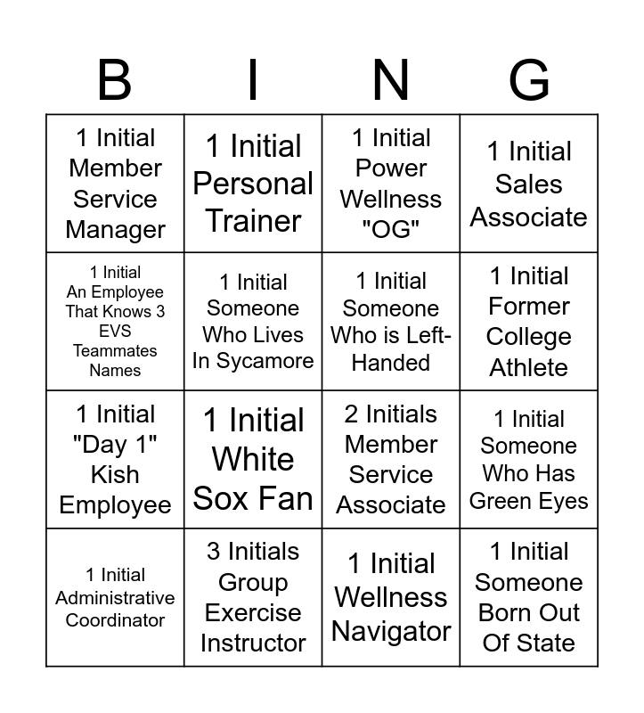 This bingo card has 16 words: 3 Initials Group Exercise Instructor, 1 Initial Someone Who Has Green Eyes, 1 Initial Power Wellness "OG", 1 Initial Member Service Manager, 1 Initial "Day 1" Kish Employee, 1 Initial Personal Trainer, 2 Initials Member Service Associate, 1 Initial Wellness Navigator, 1 Initial An Employee That Knows 3 EVS Teammates Names, 1 Initial Someone Who Lives In Sycamore, 1 Initial Administrative Coordinator, 1 Initial Sales Associate, 1 Initial White Sox Fan, 1 Initial Former College Athlete, 1 Initial Someone Who is Left-Handed and 1 Initial Someone Born Out Of State.