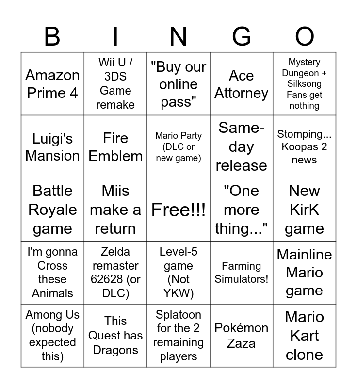 This bingo card has a free space and 24 words: Among Us (nobody expected this), Zelda remaster 62628 (or DLC), Mario Party (DLC or new game), Pokémon Zaza, Mystery Dungeon + Silksong Fans get nothing, Amazon Prime 4, Wii U / 3DS Game remake, "Buy our online pass", "One more thing...", New KirK game, Battle Royale game, Fire Emblem, Farming Simulators!, Mainline Mario game, Luigi's Mansion, This Quest has Dragons, Splatoon for the 2 remaining players, Ace Attorney, Stomping... Koopas 2 news, I'm gonna Cross these Animals, Miis make a return, Level-5 game (Not YKW), Same-day release and Mario Kart clone.
