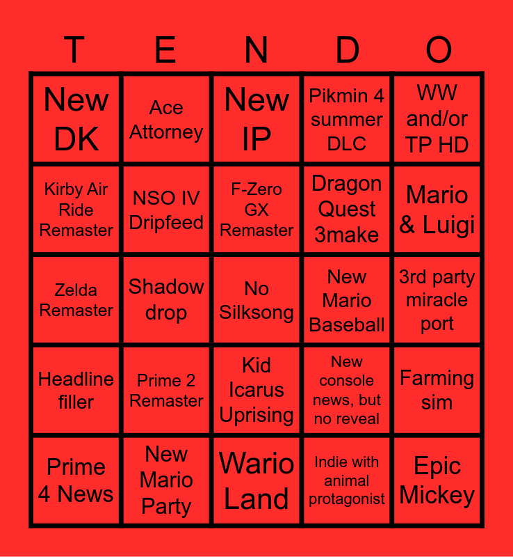 This bingo card has a free space and 24 words: Prime 2 Remaster, New Mario Party, F-Zero GX Remaster, Prime 4 News, WW and/or TP HD, New DK, Kirby Air Ride Remaster, Ace Attorney, New Mario Baseball, Kid Icarus Uprising, Dragon Quest 3make, Zelda Remaster, New console news, but no reveal, Farming sim, NSO IV Dripfeed, Indie with animal protagonist, 3rd party miracle port, New IP, Mario & Luigi, Shadow drop, Epic Mickey, Headline filler, Pikmin 4 summer DLC and Wario Land.