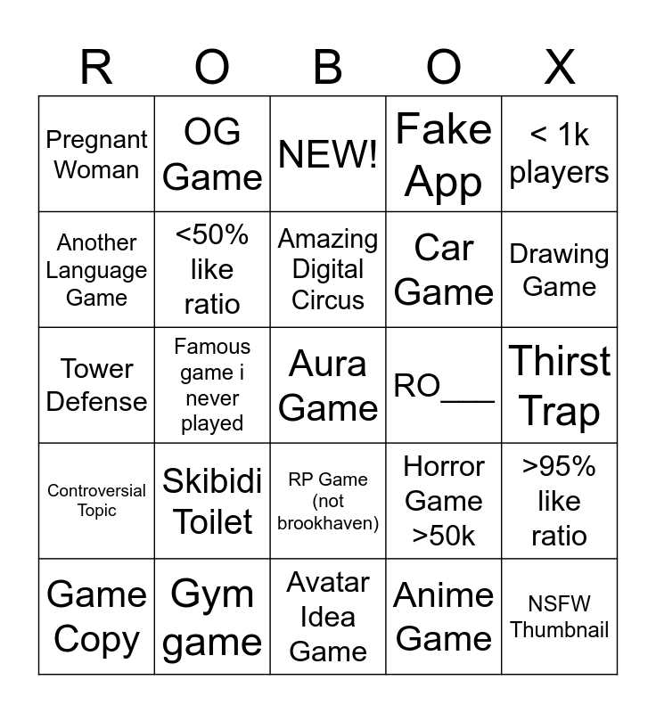 This bingo card has a free space and 24 words: Skibidi Toilet, Gym game, Amazing Digital Circus, Game Copy, < 1k players, Pregnant Woman, Another Language Game, OG Game, RO___, RP Game (not brookhaven), Car Game, Tower Defense, Horror Game >50k, >95% like ratio, <50% like ratio, Anime Game, Thirst Trap, NEW!, Drawing Game, Famous game i never played, NSFW Thumbnail, Controversial Topic, Fake App and Avatar Idea Game.