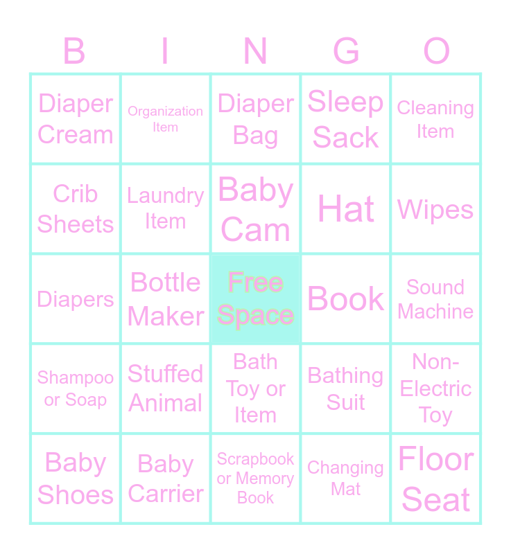 This bingo card has a free space and 47 words: Nursing Pillow, Floor Seat, Plates/ Silverware, Scrapbook or Memory Book, Stuffed Animal, Changing Table, Organization Item, Humidifier, Crib Sheets, Bouncer or Activity Center, Laundry Item, Sleep Sack, Non- Electric Toy, Bathing Suit, Pajamas, Car Seat Accessory, Baby Cam, Book, Picture Frame, Cleaning Item, Bottle Maker, Changing Mat, Diaper Cream, Hat, Baby Bib, Wipes, Baby Shoes, Electric Toy, Bath Toy or Item, Shampoo or Soap, Baby Health Item, High Chair, Play Mat, Teething Toy, Blanket, Baby Carrier, Sound Machine, Bows, Towels, Burp Cloths, Swaddle, Diaper Bag, Diapers, Bottles, Pacifier, Socks and Outfit.