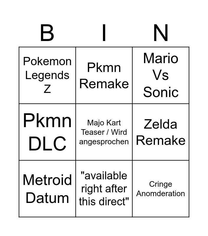 This bingo card has a free space and 8 words: Zelda Remake, Mario Vs Sonic, Pkmn Remake, Metroid Datum, Pokemon Legends Z, Cringe Anomderation, Pkmn DLC and "available right after this direct".