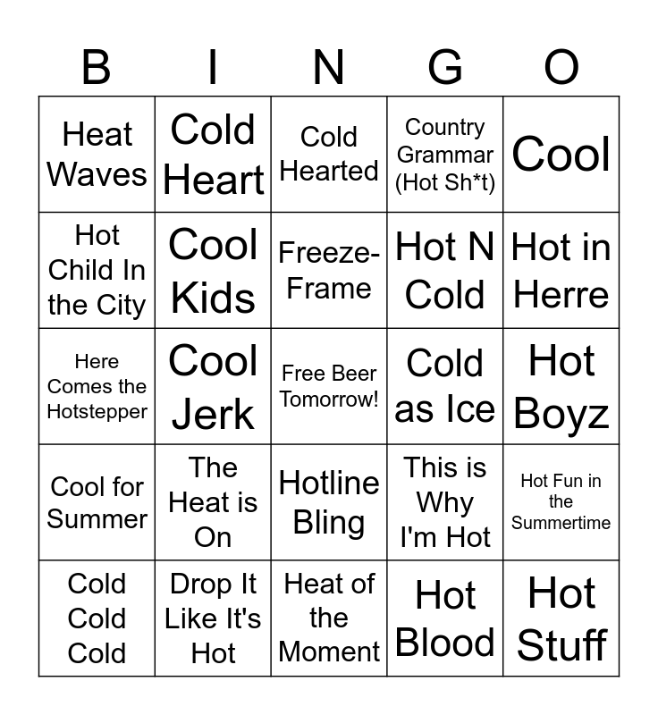 This bingo card has a free space and 33 words: Cold Water, Trying to be Cool, Cool Jerk, Long Cool Woman (in a Black Dress), Cool for Summer, Cool Kids, Cool, Cold Cold Cold, Cold Heart, Frozen, Freeze-Frame, Cold Hearted, She's So Cold, Funky Cold Medina, Cold as Ice, Hot in Herre, Drop It Like It's Hot, Here Comes the Hotstepper, The Heat is On, This is Why I'm Hot, Hotline Bling, Heatwave, Heat Waves, Hot Boyz, Heat of the Moment, Hot Stuff, Country Grammar (Hot Sh*t), Hot N Cold, Hot Child In the City, Hot Fun in the Summertime, Hot Blooded, Hot Blood and Hot For Teacher.