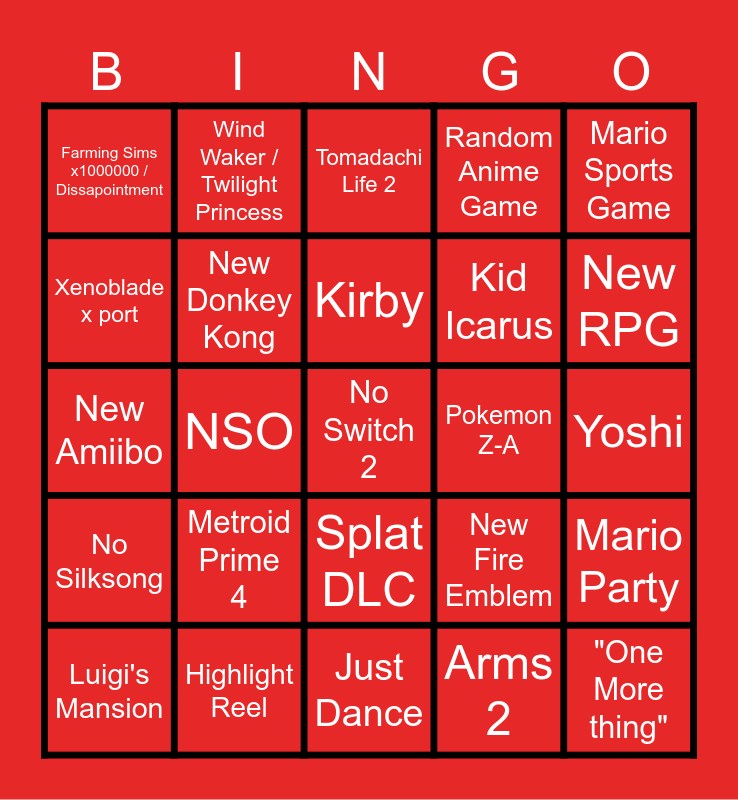 This bingo card has a free space and 24 words: Metroid Prime 4, Highlight Reel, Kirby, Luigi's Mansion, Mario Sports Game, Farming Sims x1000000 / Dissapointment, Xenoblade x port, Wind Waker / Twilight Princess, Pokemon Z-A, Splat DLC, Kid Icarus, New Amiibo, New Fire Emblem, Mario Party, New Donkey Kong, Arms 2, Yoshi, Tomadachi Life 2, New RPG, NSO, "One More thing", No Silksong, Random Anime Game and Just Dance.