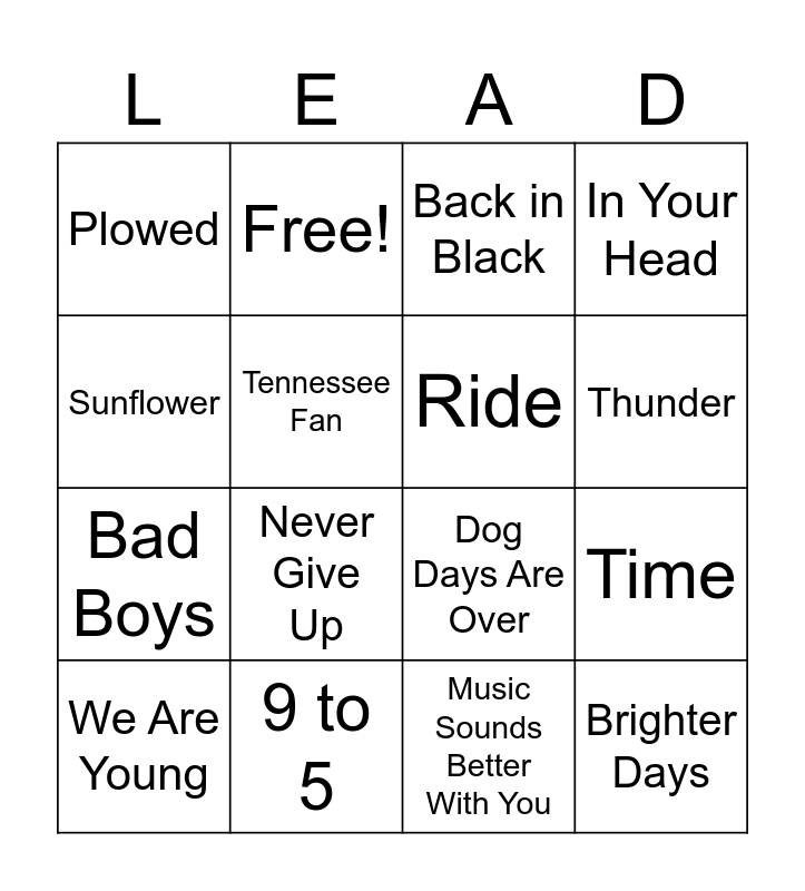 This bingo card has 16 words: 9 to 5, Time, Back in Black, Plowed, Bad Boys, Free!, Dog Days Are Over, Music Sounds Better With You, Sunflower, Tennessee Fan, We Are Young, In Your Head, Never Give Up, Thunder, Ride and Brighter Days.