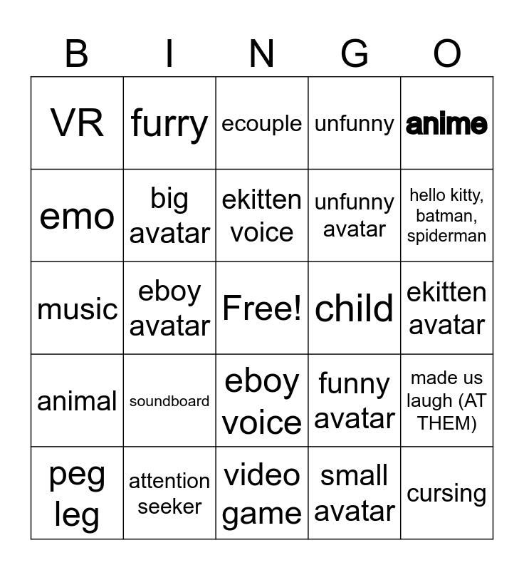 This bingo card has a free space and 24 words: soundboard, attention seeker, ekitten voice, peg leg, anime, VR, emo, furry, child, eboy voice, unfunny avatar, music, funny avatar, made us laugh (AT THEM), big avatar, small avatar, ekitten avatar, ecouple, hello kitty, batman, spiderman, eboy avatar, cursing, animal, unfunny and video game.