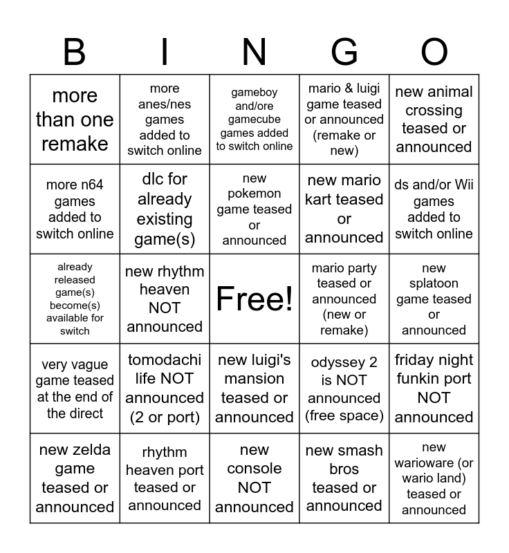 This bingo card has a free space and 25 words: tomodachi life NOT announced (2 or port), new console NOT announced, new pokemon game teased or announced, new zelda game teased or announced, new animal crossing teased or announced, more than one remake, more n64 games added to switch online, more anes/nes games added to switch online, mario party teased or announced (new or remake), new luigi's mansion teased or announced, new mario kart teased or announced, already released game(s) become(s) available for switch, odyssey 2 is NOT announced (free space), friday night funkin port NOT announced, dlc for already existing game(s), new handheld NOT announced, new splatoon game teased or announced, gameboy and/ore gamecube games added to switch online, ds and/or Wii games added to switch online, new rhythm heaven NOT announced, new warioware (or wario land) teased or announced, rhythm heaven port teased or announced, very vague game teased at the end of the direct, mario & luigi game teased or announced (remake or new) and new smash bros teased or announced.