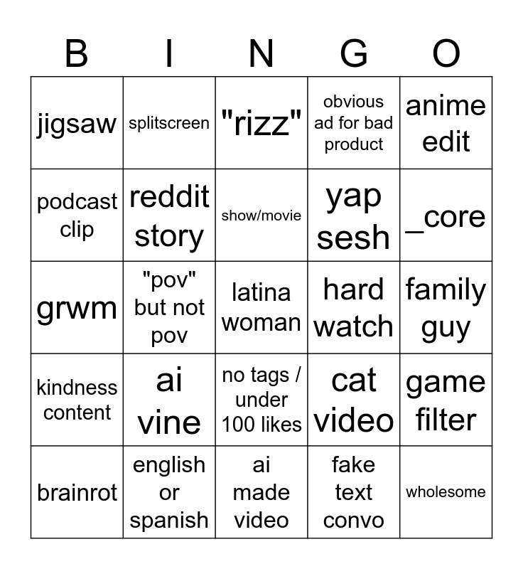 This bingo card has a free space and 24 words: ai vine, english or spanish, show/movie, brainrot, anime edit, jigsaw, podcast clip, splitscreen, hard watch, no tags / under 100 likes, yap sesh, grwm, cat video, game filter, reddit story, fake text convo, family guy, "rizz", _core, "pov" but not pov, wholesome, kindness content, obvious ad for bad product and ai made video.