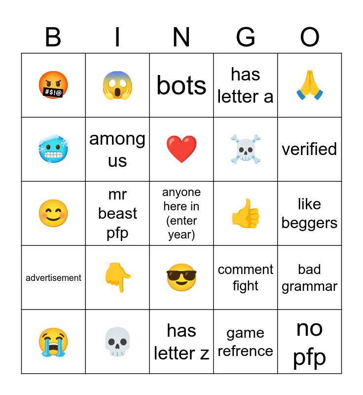 This bingo card has a free space and 24 words: 👇, 💀, ❤️, 😭, 🙏, 🤬, 🥶, 😱, 👍, 😎, ☠️, 😊, comment fight, bad grammar, among us, game refrence, like beggers, bots, verified, mr beast pfp, no pfp, advertisement, has letter a and has letter z.