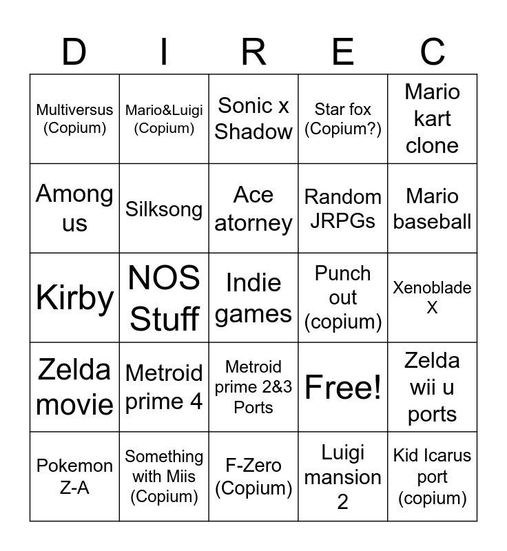 This bingo card has 25 words: Metroid prime 4, F-Zero (Copium), Ace atorney, Pokemon Z-A, Mario kart clone, Multiversus (Copium), Among us, Mario&Luigi (Copium), Punch out (copium), Metroid prime 2&3 Ports, Random JRPGs, Kirby, Free!, Zelda wii u ports, Silksong, Kid Icarus port (copium), Xenoblade X, Sonic x Shadow, Mario baseball, NOS Stuff, Indie games, Something with Miis (Copium), Zelda movie, Star fox (Copium?) and Luigi mansion 2.