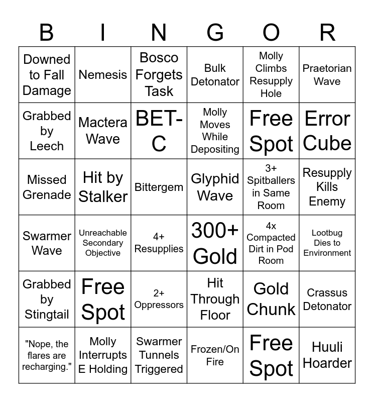 This bingo card has 36 words: Hit Through Floor, 2+ Oppressors, Frozen/On Fire, Grabbed by Leech, Swarmer Wave, Glyphid Wave, Mactera Wave, Swarmer Tunnels Triggered, Molly Climbs Resupply Hole, Gold Chunk, Error Cube, Bulk Detonator, Crassus Detonator, Hit by Stalker, Molly Moves While Depositing, Downed to Fall Damage, Grabbed by Stingtail, 3+ Spitballers in Same Room, Missed Grenade, Bosco Forgets Task, Bittergem, Unreachable Secondary Objective, 300+ Gold, 4+ Resupplies, 4x Compacted Dirt in Pod Room, Nemesis, Free Spot, Molly Interrupts E Holding, BET-C, Praetorian Wave, Huuli Hoarder, "Nope, the flares are recharging.", Lootbug Dies to Environment, Resupply Kills Enemy, Free Spot and Free Spot.