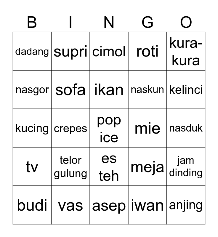 This bingo card has a free space and 24 words: telor gulung, vas, ikan, budi, kura-kura, dadang, nasgor, supri, mie, es teh, naskun, kucing, meja, jam dinding, sofa, iwan, nasduk, cimol, kelinci, crepes, anjing, tv, roti and asep.