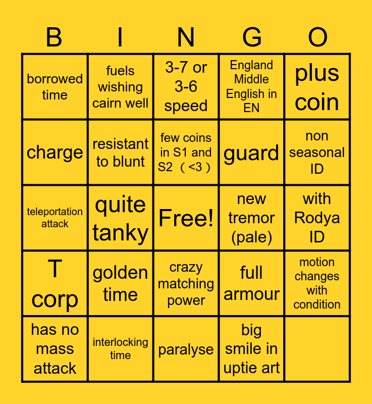 This bingo card has a free space and 24 words: T corp, interlocking time, crazy matching power, full armour, plus coin, borrowed time, fuels wishing cairn well, 3-7 or 3-6 speed, guard, motion changes with condition, charge, resistant to blunt, deals slash damage, new tremor (pale), non seasonal ID, has no mass attack, quite tanky, few coins in S1 and S2 (<3), England Middle English in EN, with Rodya ID, teleportation attack, golden time, paralyse and big smile in uptie art.
