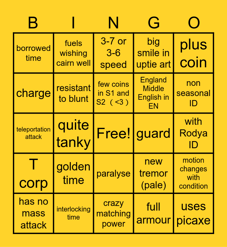 This bingo card has a free space and 25 words: T corp, interlocking time, crazy matching power, full armour, plus coin, borrowed time, fuels wishing cairn well, 3-7 or 3-6 speed, guard, motion changes with condition, charge, resistant to blunt, deals slash damage, new tremor (pale), non seasonal ID, has no mass attack, quite tanky, few coins in S1 and S2 (<3), England Middle English in EN, with Rodya ID, teleportation attack, golden time, paralyse, big smile in uptie art and uses picaxe.
