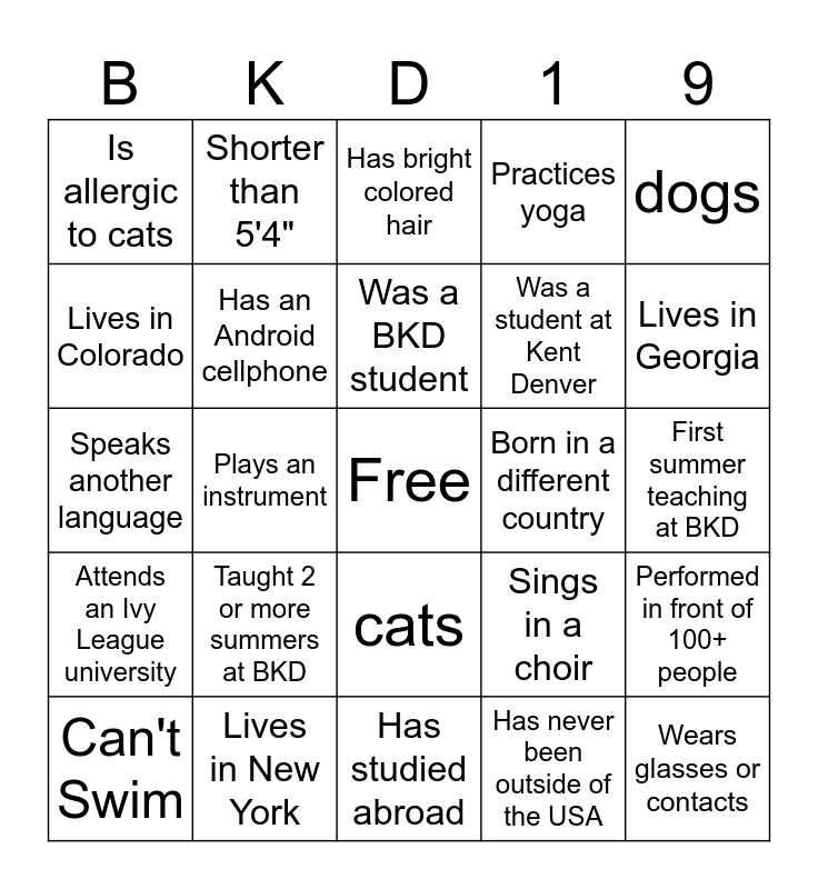 This bingo card has a free space and 27 words: Sings in a choir, Is 6 feet tall or taller, Was a student at Kent Denver, Has studied abroad, Lives in Colorado, Has bright colored hair, Shorter than 5'4", Attends an Ivy League university, Born in a different country, Performed in front of 100+ people, Speaks another language, Practices yoga, Can't Swim, Lives in New York, Lives in Georgia, Goes to school out of Colorado, Has an Android cellphone, Was a BKD student, Taught 2 or more summers at BKD, Is allergic to cats, First summer teaching at BKD, Has never been outside of the USA, Plays an instrument, Wears glasses or contacts, cats, dogs and pets.