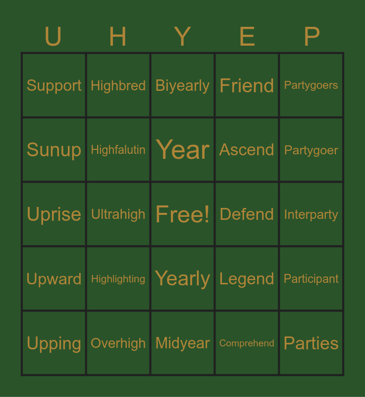 This bingo card has a free space and 75 words: Group, Higher, Year, Lend, Partyer, Pupil, Highly, Years, Tend, Partying, Upped, Highest, Yearly, Ascend, Partyers, Sunup, Overhigh, Yearend, Blend, Partygoer, Super, Highbred, Midyear, Friend, Partygoers, Supra, Highlife, Yearends, Amend, Multiparty, Upend, Highborn, Midyears, Legend, Interparty, Support, Highness, Yearbook, Defend, Parties, Pupil, Highlight, Yearlong, Commend, Partier, Upgrade, Ultrahigh, Biyearly, Godsend, Partiers, Supreme, Highfalutin, Yearbooks, Splendid, Partied, Upper, Highlander, Multiyear, Endearing, Parting, Upping, Highnesses, Yeasteryear, Transcend, Participate, Uprise, Highlighted, Yearling, Tremendous, Participant, Upward, Highlighting, Yearlings, Comprehend and Participated.