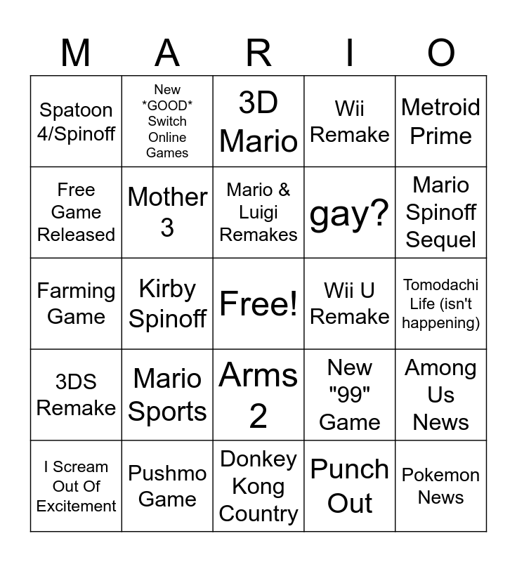 This bingo card has a free space and 24 words: Mario Sports, Pushmo Game, Mario & Luigi Remakes, I Scream Out Of Excitement, Metroid Prime, Spatoon 4/Spinoff, Free Game Released, New *GOOD* Switch Online Games, Wii U Remake, Arms 2, gay?, Farming Game, New "99" Game, Among Us News, Mother 3, Punch Out, Tomodachi Life (isn't happening), 3D Mario, Mario Spinoff Sequel, Kirby Spinoff, Pokemon News, 3DS Remake, Wii Remake and Donkey Kong Country.