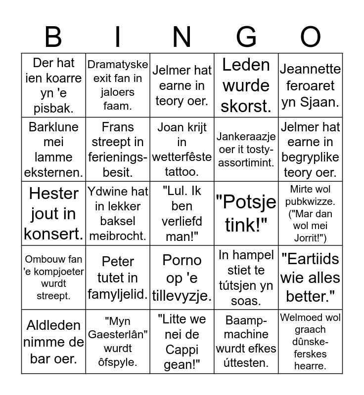 This bingo card has 25 words: Peter tutet in famyljelid., "Litte we nei de Cappi gean!", Joan krijt in wetterfêste tattoo., Aldleden nimme de bar oer., Jeannette feroaret yn Sjaan., Der hat ien koarre yn 'e pisbak., Barklune mei lamme eksternen., Dramatyske exit fan in jaloers faam., "Potsje tink!", Porno op 'e tillevyzje., Jankeraazje oer it tosty-assortimint., Hester jout in konsert., In hampel stiet te tútsjen yn soas., "Eartiids wie alles better.", Frans streept in ferienings-besit., Welmoed wol graach dûnske-ferskes hearre., Mirte wol pubkwizze. ("Mar dan wol mei Jorrit!"), Jelmer hat earne in teory oer., Jelmer hat earne in begryplike teory oer., Ydwine hat in lekker baksel meibrocht., "Lul. Ik ben verliefd man!", "Myn Gaesterlân" wurdt ôfspyle., Ombouw fan 'e kompjoeter wurdt streept., Leden wurde skorst. and Baamp-machine wurdt efkes úttesten..