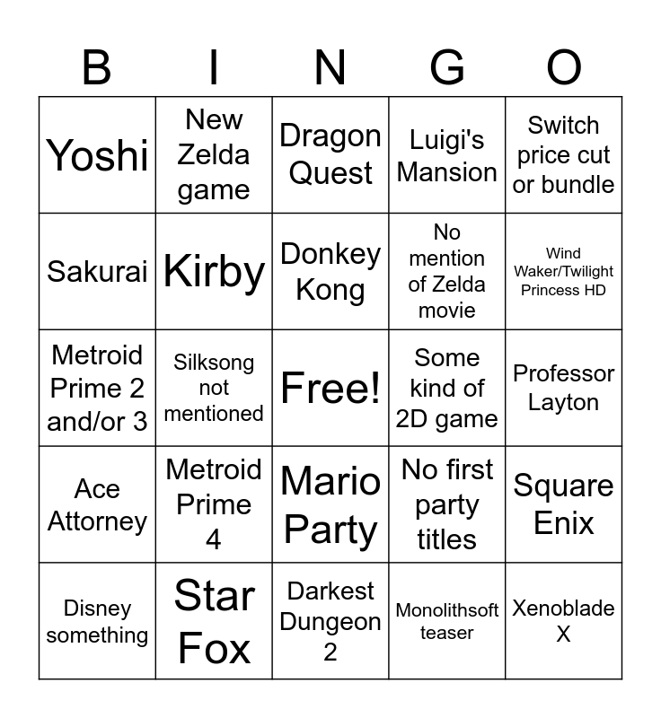This bingo card has a free space and 24 words: Metroid Prime 4, Star Fox, Donkey Kong, Disney something, Switch price cut or bundle, Yoshi, Sakurai, New Zelda game, Some kind of 2D game, Mario Party, No mention of Zelda movie, Metroid Prime 2 and/or 3, No first party titles, Square Enix, Kirby, Monolithsoft teaser, Professor Layton, Dragon Quest, Wind Waker/Twilight Princess HD, Silksong not mentioned, Xenoblade X, Ace Attorney, Luigi's Mansion and Darkest Dungeon 2.