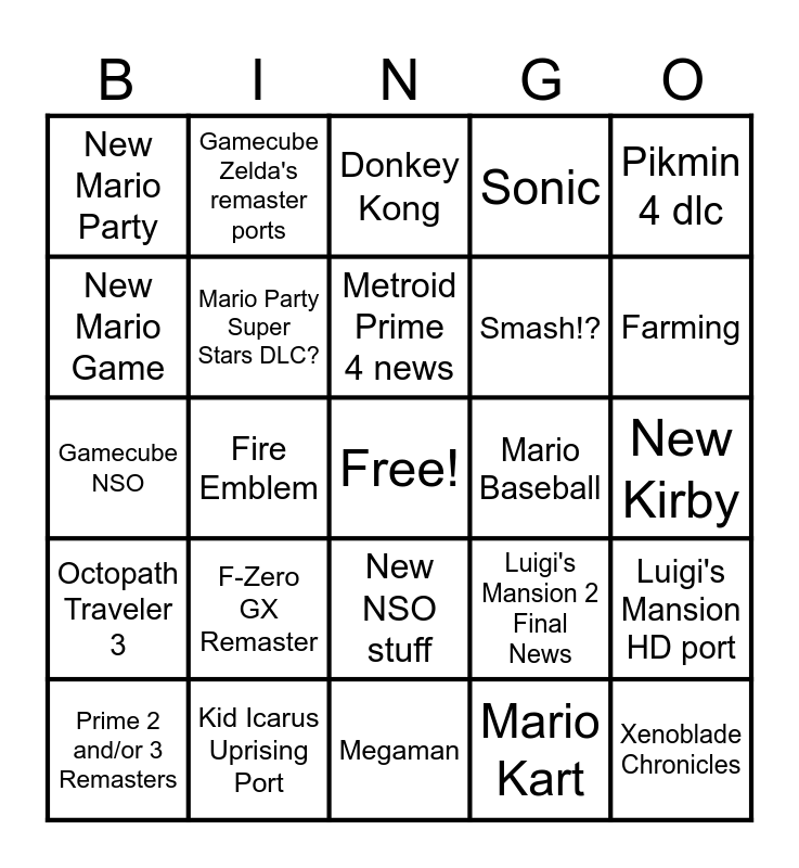 This bingo card has a free space and 24 words: F-Zero GX Remaster, Kid Icarus Uprising Port, Metroid Prime 4 news, Prime 2 and/or 3 Remasters, Pikmin 4 dlc, New Mario Party, New Mario Game, Gamecube Zelda's remaster ports, Mario Baseball, New NSO stuff, Smash!?, Gamecube NSO, Luigi's Mansion 2 Final News, Luigi's Mansion HD port, Mario Party Super Stars DLC?, Mario Kart, New Kirby, Donkey Kong, Farming, Fire Emblem, Xenoblade Chronicles, Octopath Traveler 3, Sonic and Megaman.