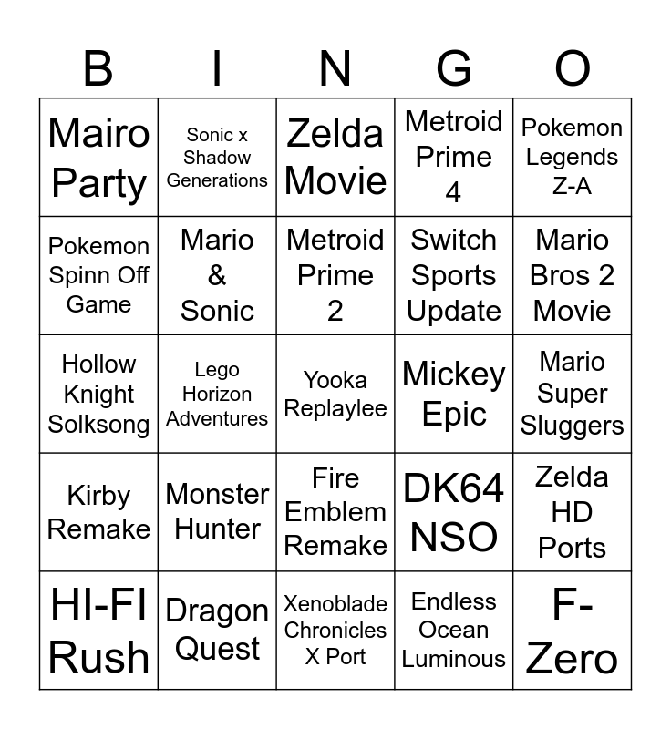 This bingo card has a free space and 24 words: Monster Hunter, Dragon Quest, Metroid Prime 2, HI-FI Rush, Pokemon Legends Z-A, Mairo Party, Pokemon Spinn Off Game, Sonic x Shadow Generations, Mickey Epic, Fire Emblem Remake, Switch Sports Update, Hollow Knight Solksong, DK64 NSO, Zelda HD Ports, Mario & Sonic, Endless Ocean Luminous, Mario Super Sluggers, Zelda Movie, Mario Bros 2 Movie, Lego Horizon Adventures, F-Zero, Kirby Remake, Metroid Prime 4 and Xenoblade Chronicles X Port.
