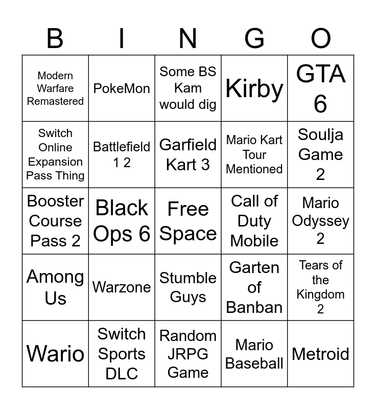 This bingo card has a free space and 24 words: Warzone, Switch Sports DLC, Garfield Kart 3, Wario, GTA 6, Modern Warfare Remastered, Switch Online Expansion Pass Thing, PokeMon, Call of Duty Mobile, Stumble Guys, Mario Kart Tour Mentioned, Booster Course Pass 2, Garten of Banban, Tears of the Kingdom 2, Battlefield 1 2, Mario Baseball, Mario Odyssey 2, Some BS Kam would dig, Soulja Game 2, Black Ops 6, Metroid, Among Us, Kirby and Random JRPG Game.