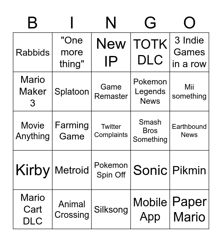 This bingo card has a free space and 24 words: Metroid, Animal Crossing, Game Remaster, Mario Cart DLC, 3 Indie Games in a row, Rabbids, Mario Maker 3, "One more thing", Smash Bros Something, Pokemon Spin Off, Pokemon Legends News, Movie Anything, Sonic, Pikmin, Splatoon, Mobile App, Earthbound News, New IP, Mii something, Farming Game, Paper Mario, Kirby, TOTK DLC and Silksong.
