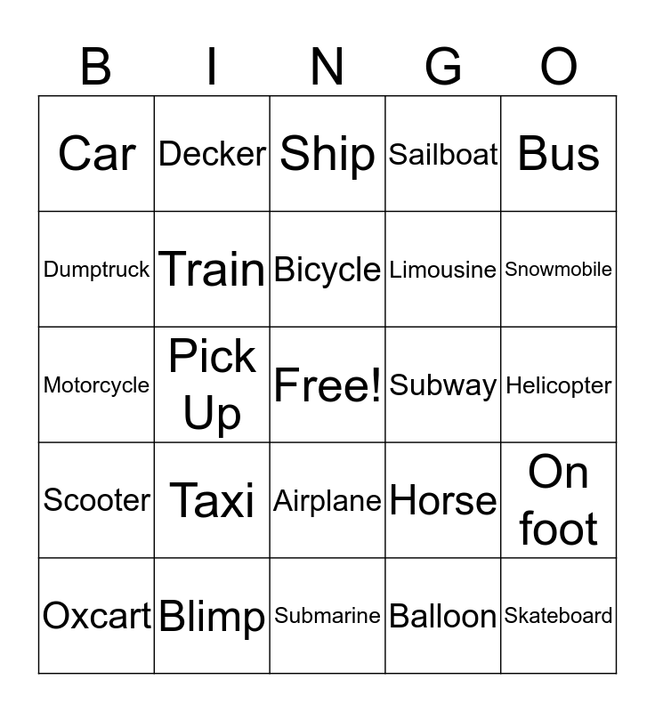 This bingo card has a free space and 26 words: Airplane, Balloon, Bicycle, Blimp, Bus, Car, Dumptruck, Decker, Helicopter, Horse, Limousine, Motorcycle, On foot, Oxcart, Pick Up, Rocket, Sailboat, Scooter, Ship, Skateboard, Snowmobile, Submarine, Subway, Taxi, Train and Truck.