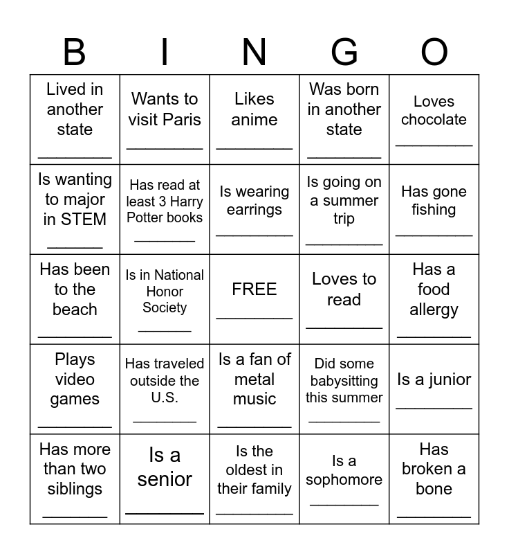 This bingo card has a free space and 24 words: Has traveled outside the U.S. ________, Is a senior _______, Is wearing earrings _________, Has more than two siblings _______, Loves chocolate _________, Lived in another state ________, Is wanting to major in STEM ______, Wants to visit Paris ________, Loves to read ________, Is a fan of metal music ________, Is going on a summer trip _________, Has been to the beach ________, Did some babysitting this summer _________, Is a junior ________, Has read at least 3 Harry Potter books ________, Is a sophomore ________, Has a food allergy ________, Likes anime ________, Has gone fishing _________, Is in National Honor Society _______, Has broken a bone ________, Plays video games ________, Was born in another state ________ and Is the oldest in their family _________.