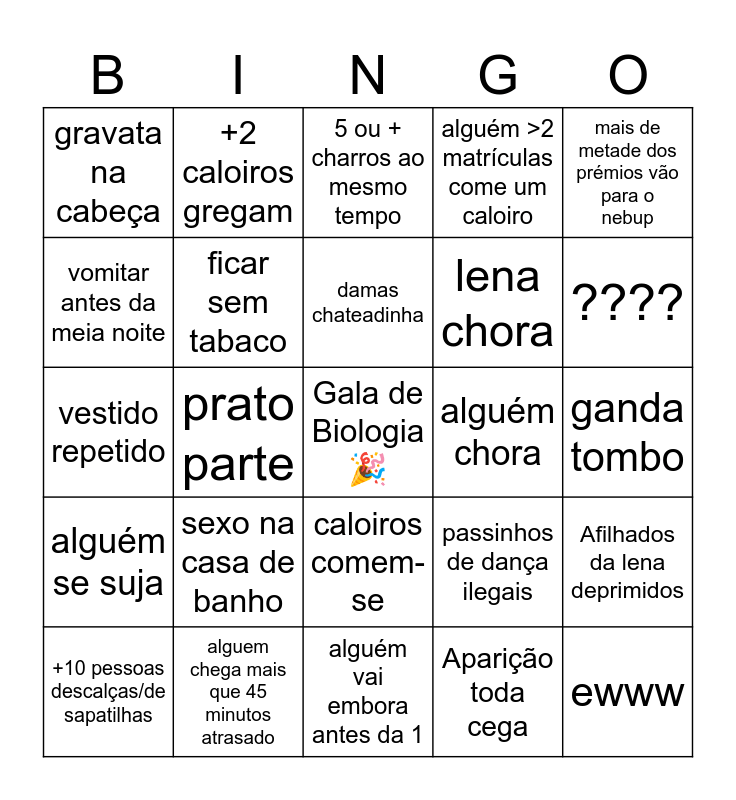 This bingo card has a free space and 39 words: Drama de lontras, hinos, Bob assedia, passinhos de dança ilegais, Afilhados da lena deprimidos, alguém se suja, prato parte, ca puta de sede, alguém chora, ganda tombo, vomitar antes da meia noite, +2 caloiros gregam, penta, ????, vestido repetido, sexo na casa de banho, caloiros comem-se, alguém >2 matrículas come um caloiro, porrada, +10 pessoas descalças/de sapatilhas, ficar sem tabaco, damas chateadinha, Aparição toda cega, mais de metade dos prémios vão para o nebup, super tesao simp, alguem chega mais que 45 minutos atrasado, alguém vai embora antes da 1, Doutores amigos, sapatos fodem-se, gravata na cabeça, sem/abrir camisa, lontras main character, lena chora, ewww, damas da discurso sobre o nebup, prancha, 5 ou + charros ao mesmo tempo, drama amoroso do pedro silva and item roubado.