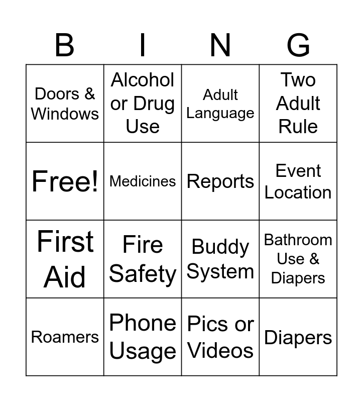 This bingo card has 16 words: Phone Usage, Bathroom Use & Diapers, Adult Language, Doors & Windows, First Aid, Alcohol or Drug Use, Buddy System, Pics or Videos, Free!, Medicines, Roamers, Two Adult Rule, Fire Safety, Event Location, Reports and Diapers.