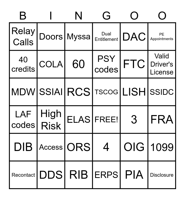This bingo card has 36 words: 4, ORS, ERPS, 40 credits, LAF codes, TSCOG, COLA, RIB, DAC, OIG, Valid Driver's License, Dual Entitlement, 1099, SSIAI, PSY codes, Relay Calls, DIB, LISH, MDW, Myssa, RCS, High Risk, FREE!, ELAS, 3, Doors, FTC, DDS, 60, PE Appointments, Disclosure, Recontact, FRA, SSIDC, Access and PIA.