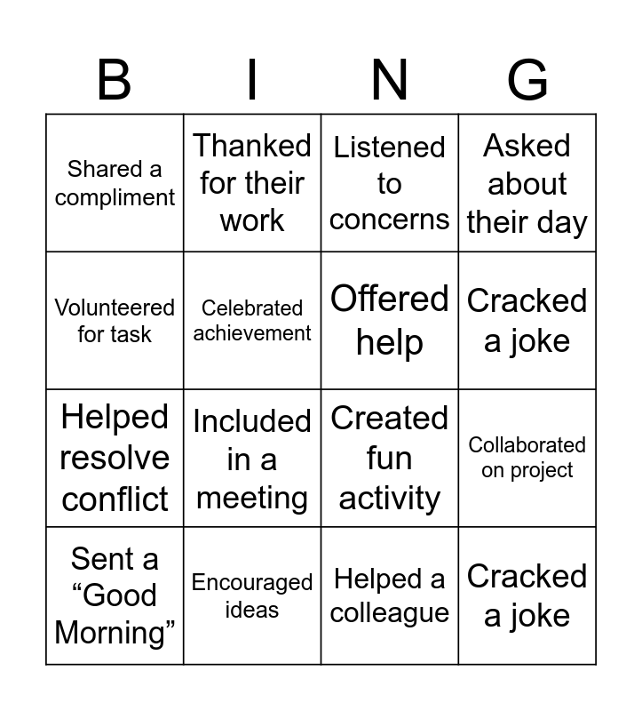 This bingo card has 17 words: Helped a colleague, Sent a “Good Morning”, Listened to concerns, Shared a compliment, Included in a meeting, Asked about their day, Collaborated on project, Offered help, Cracked a joke, Celebrated achievement, Encouraged ideas, Created fun activity, Volunteered for task, Thanked for their work, Helped resolve conflict, Thanked someone for their work and Cracked a joke.