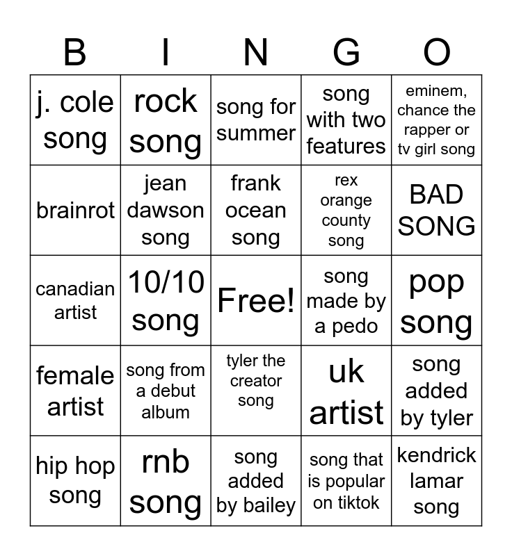 This bingo card has a free space and 24 words: song from a debut album, rnb song, frank ocean song, hip hop song, eminem, chance the rapper or tv girl song, j. cole song, brainrot, rock song, song made by a pedo, tyler the creator song, rex orange county song, canadian artist, uk artist, song added by tyler, jean dawson song, song that is popular on tiktok, pop song, song for summer, BAD SONG, 10/10 song, kendrick lamar song, female artist, song with two features and song added by bailey.