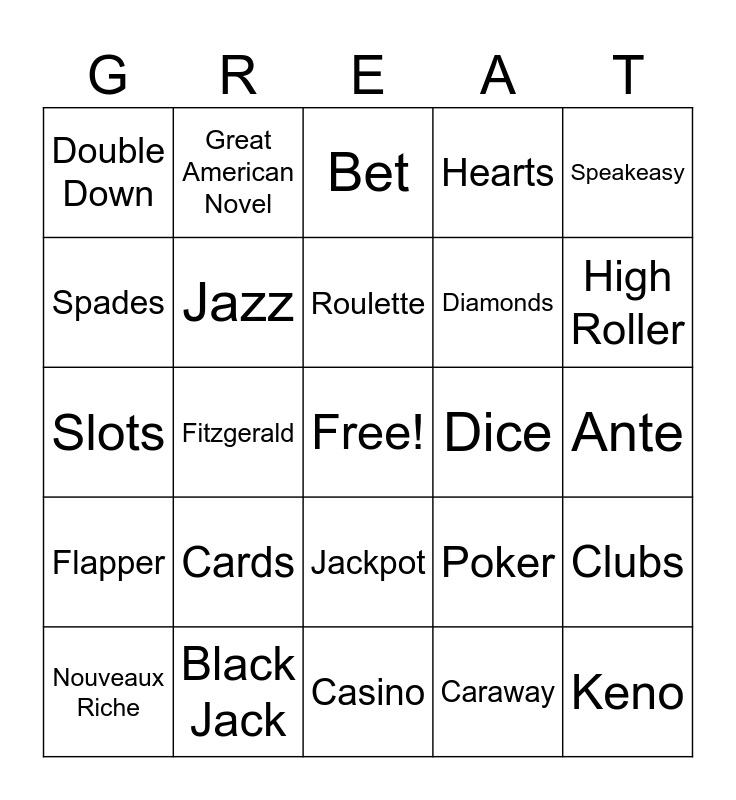 This bingo card has a free space and 33 words: Daisy Buchanan, Tom Buchanan, Fitzgerald, French Riviera, Flapper, Jazz, Speakeasy, Nouveaux Riche, Great American Novel, Dealer, Roulette, Bet, Winning, Losing, Dice, High Roller, Black Jack, Slots, Cards, Poker, Jackpot, Gambling, Double Down, Ante, Casino, Keno, Hearts, Diamonds, Spades, Clubs, Gatsby, Caraway and Roaring 20’s.