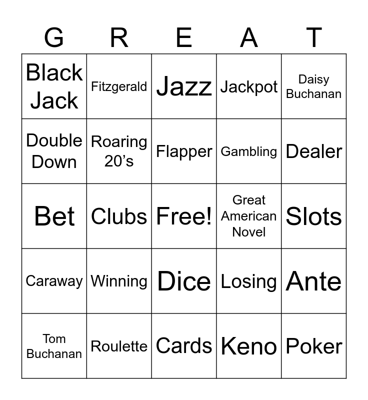 This bingo card has a free space and 33 words: Diamonds, Spades, Clubs, Gatsby, Caraway, Roaring 20’s, Daisy Buchanan, Tom Buchanan, Fitzgerald, French Riviera, Flapper, Jazz, Speakeasy, Nouveaux Riche, Great American Novel, Dealer, Roulette, Bet, Winning, Losing, Dice, High Roller, Black Jack, Slots, Cards, Poker, Jackpot, Gambling, Double Down, Ante, Casino, Keno and Hearts.