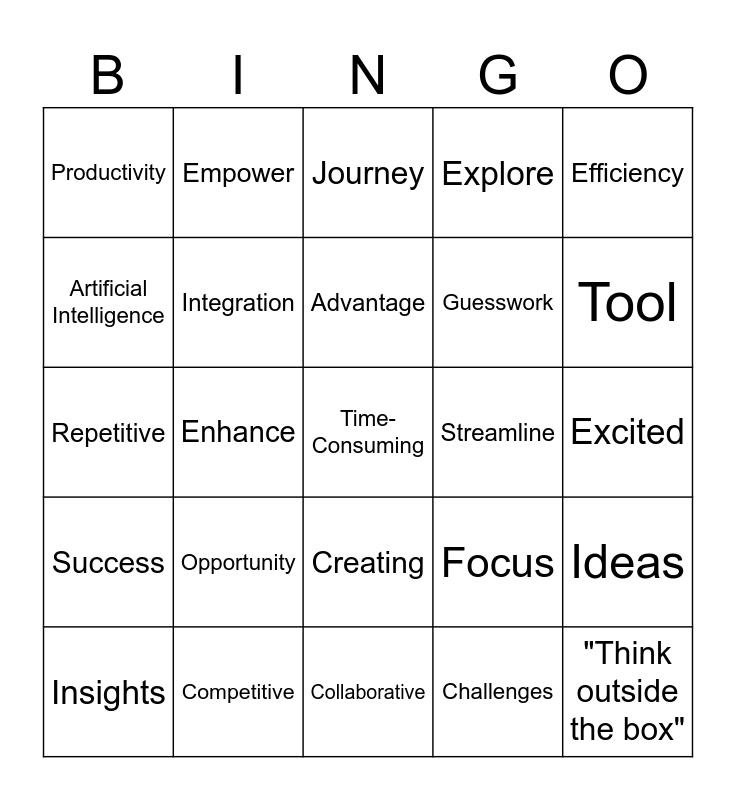 This bingo card has a free space and 24 words: Opportunity, Competitive, Advantage, Insights, Efficiency, Productivity, Artificial Intelligence, Empower, Streamline, Creating, Guesswork, Repetitive, Focus, Ideas, Integration, Challenges, Excited, Journey, Tool, Enhance, "Think outside the box", Success, Explore and Collaborative.