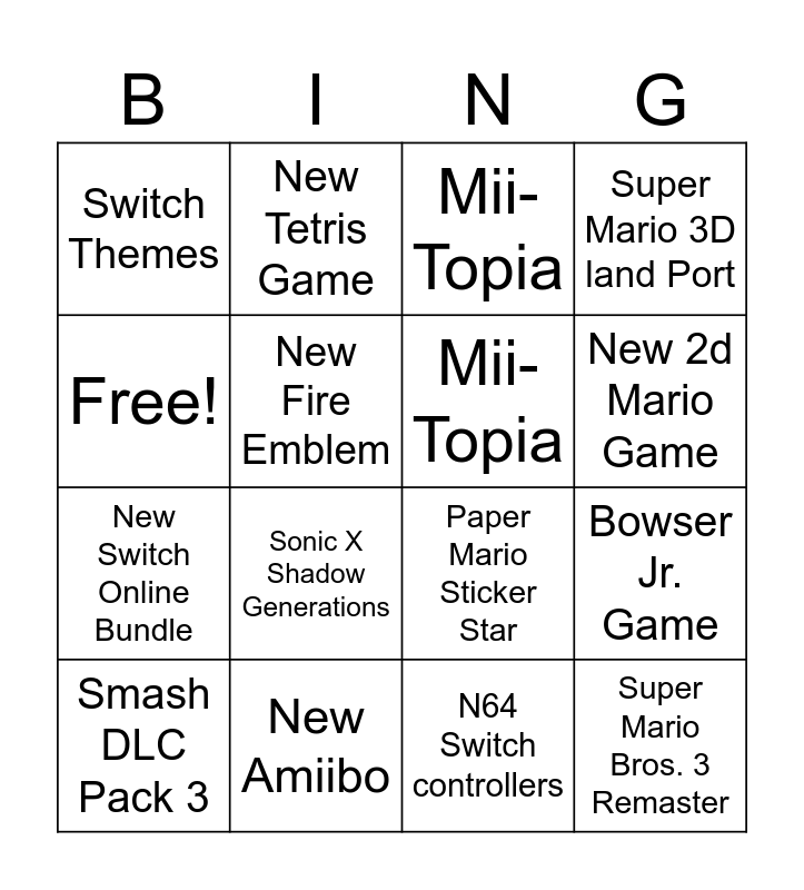 This bingo card has 16 words: New Amiibo, Bowser Jr. Game, Mii-Topia, Switch Themes, New Switch Online Bundle, New Tetris Game, Paper Mario Sticker Star, N64 Switch controllers, Free!, New Fire Emblem, Smash DLC Pack 3, Super Mario 3D land Port, Sonic X Shadow Generations, New 2d Mario Game, Mii-Topia and Super Mario Bros. 3 Remaster.
