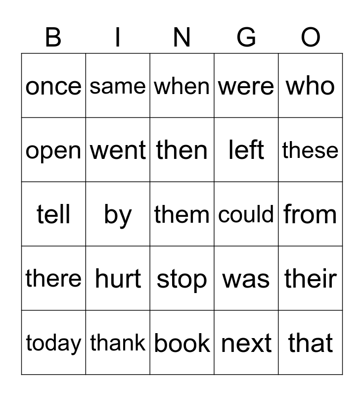 This bingo card has a free space and 36 words: now, do, which, went, was, there, then, out, who, good, by, were, our, could, these, once, upon, hurt, that, when, from, their, thank, today, book, same, tell, work, left, open, still, took, next, stop, shout and because.
