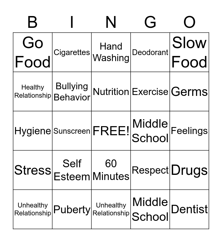 This bingo card has a free space and 24 words: Self Esteem, Puberty, Nutrition, Unhealthy Relationship, Slow Food, Go Food, Healthy Relationship, Cigarettes, Middle School, 60 Minutes, Exercise, Hygiene, Respect, Drugs, Bullying Behavior, Middle School, Feelings, Hand Washing, Germs, Sunscreen, Dentist, Stress, Deodorant and Unhealthy Relationship.