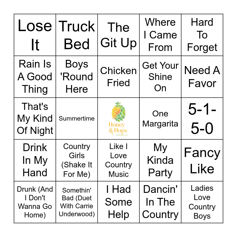 This bingo card has a free space and 32 words: Dancin' In The Country, Beer Can't Fix, Summertime, Cowgirls, Drink In My Hand, Boys 'Round Here, Hard To Forget, Fancy Like, Truck Bed, Old Town Road (Remix), Chicken Fried, The Git Up, Dirt On My Boots, Cruise, One Margarita, Honky Tonk Badonkadonk, Drunk (And I Don't Wanna Go Home), That's My Kind Of Night, Like I Love Country Music, Country Girls (Shake It For Me), My Kinda Party, Boondocks, 5-1-5-0, Somethin' Bad (Duet With Carrie Underwood), Ladies Love Country Boys, Where I Came From, Get Your Shine On, Rain Is A Good Thing, Lose It, I Had Some Help, Ain't No Love In Oklahoma (FromTwisters: The Album) and Need A Favor.