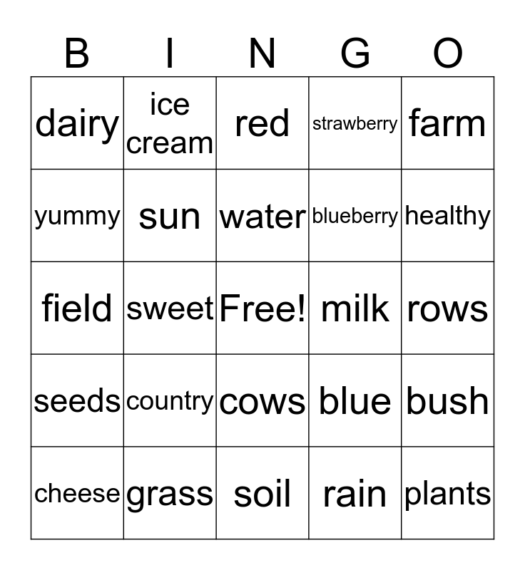 This bingo card has a free space and 24 words: country, grass, water, cheese, farm, dairy, yummy, ice cream, milk, cows, blueberry, field, blue, bush, sun, rain, rows, red, healthy, sweet, plants, seeds, strawberry and soil.